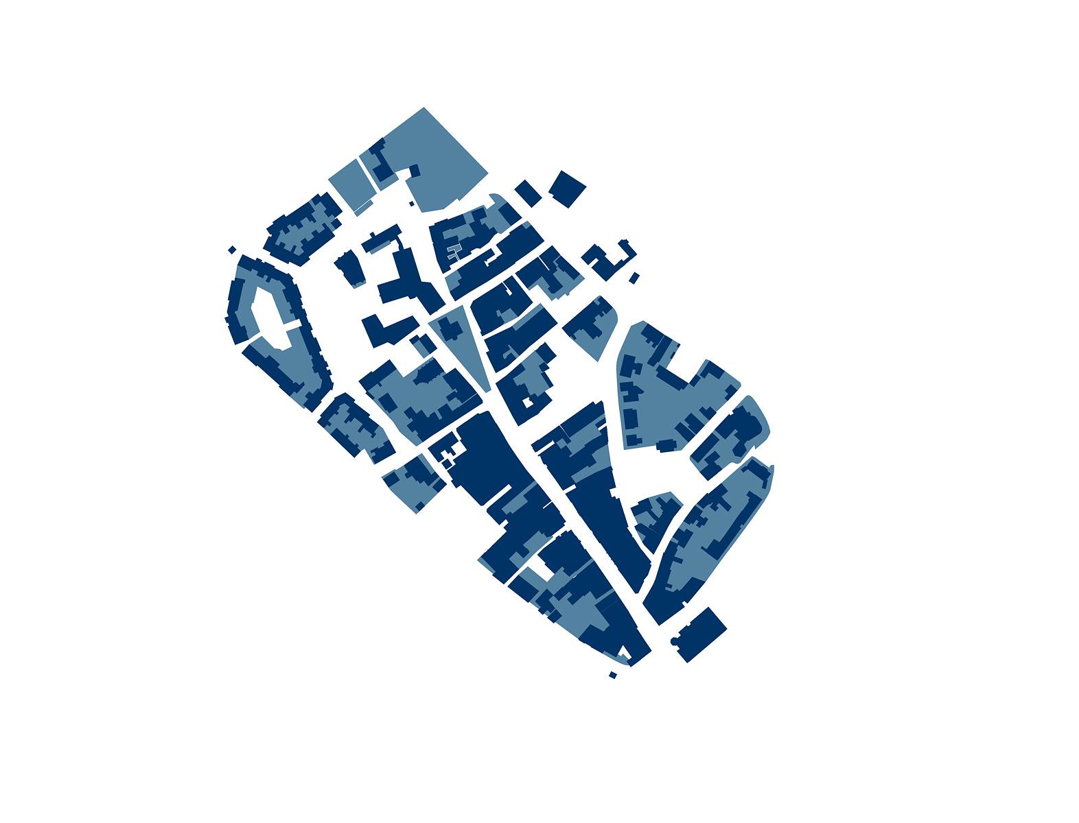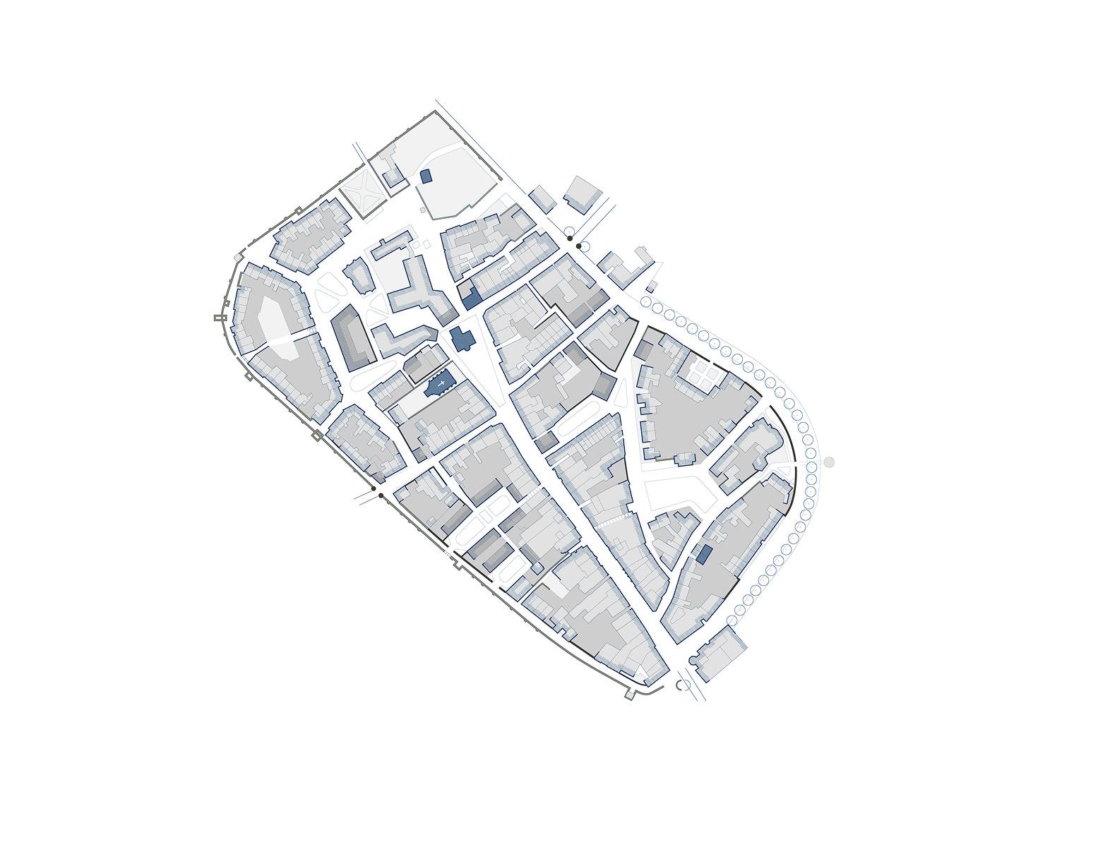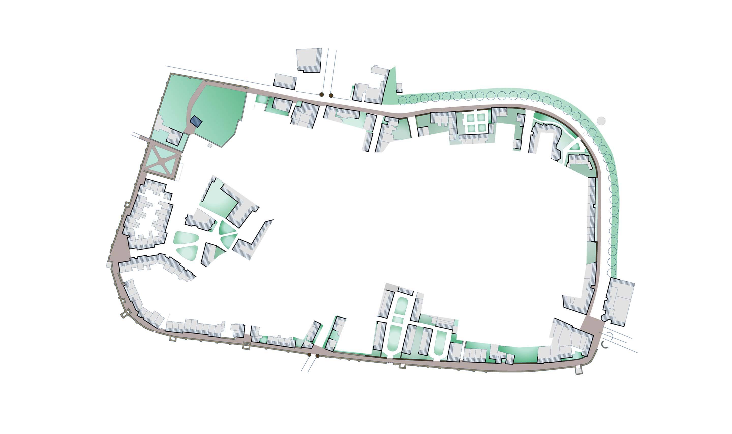 Behind the main streets and the Market Square, space currently dissipates in many places and, in terms of scale, can even exceed that of the Market itself. The urban fabric has eroded. The challenge is to transform these areas back into intimate streets, small squares and courtyards by intelligently adding buildings and greenery. Behind the main streets, a different world can then emerge, one to wander through and enjoy, with surprising views of historic buildings and hidden places.