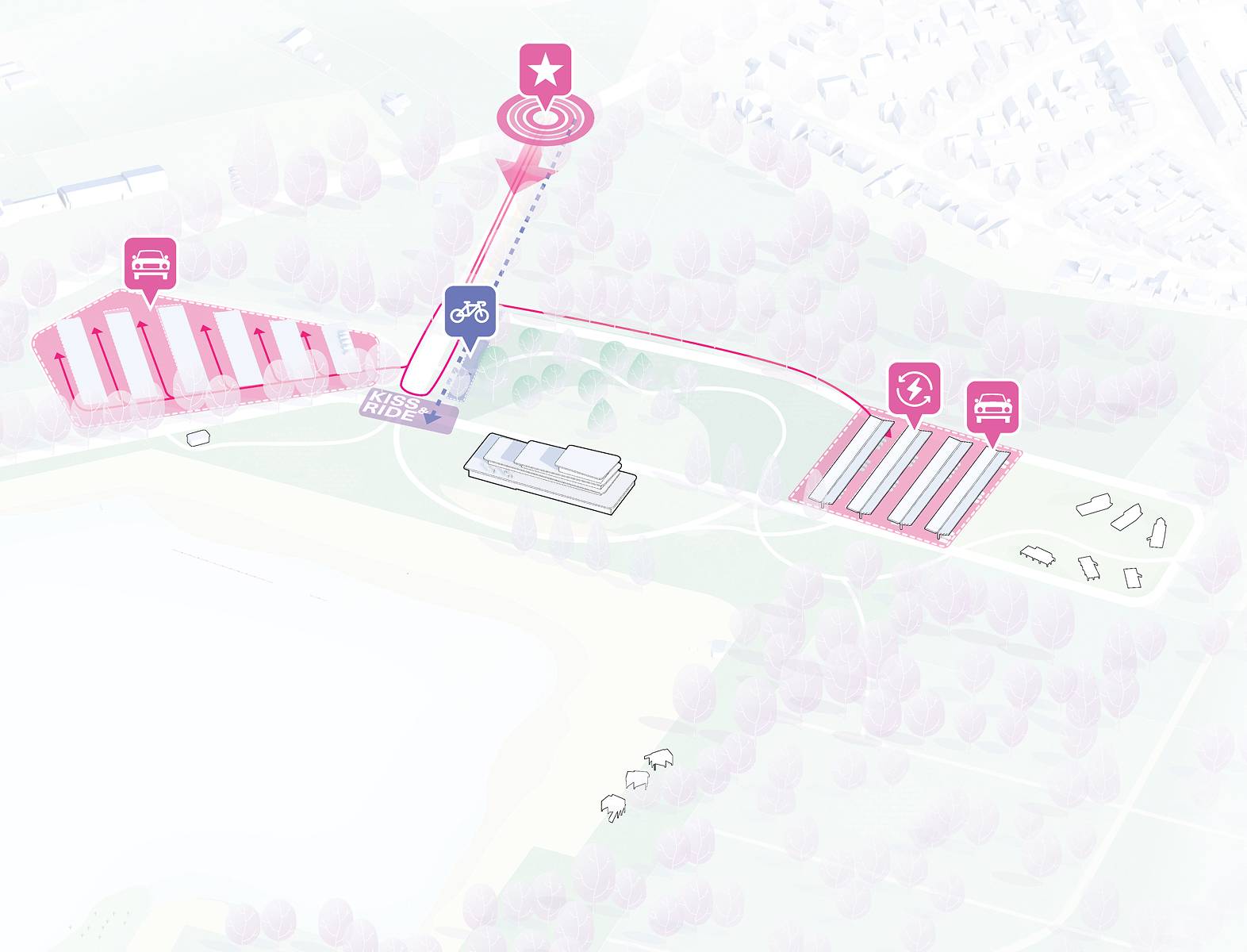 Door het parkeerterrein naar het oosten te verplaatsen, kan het huidige parkeerterrein weer getransformeerd worden naar bos.