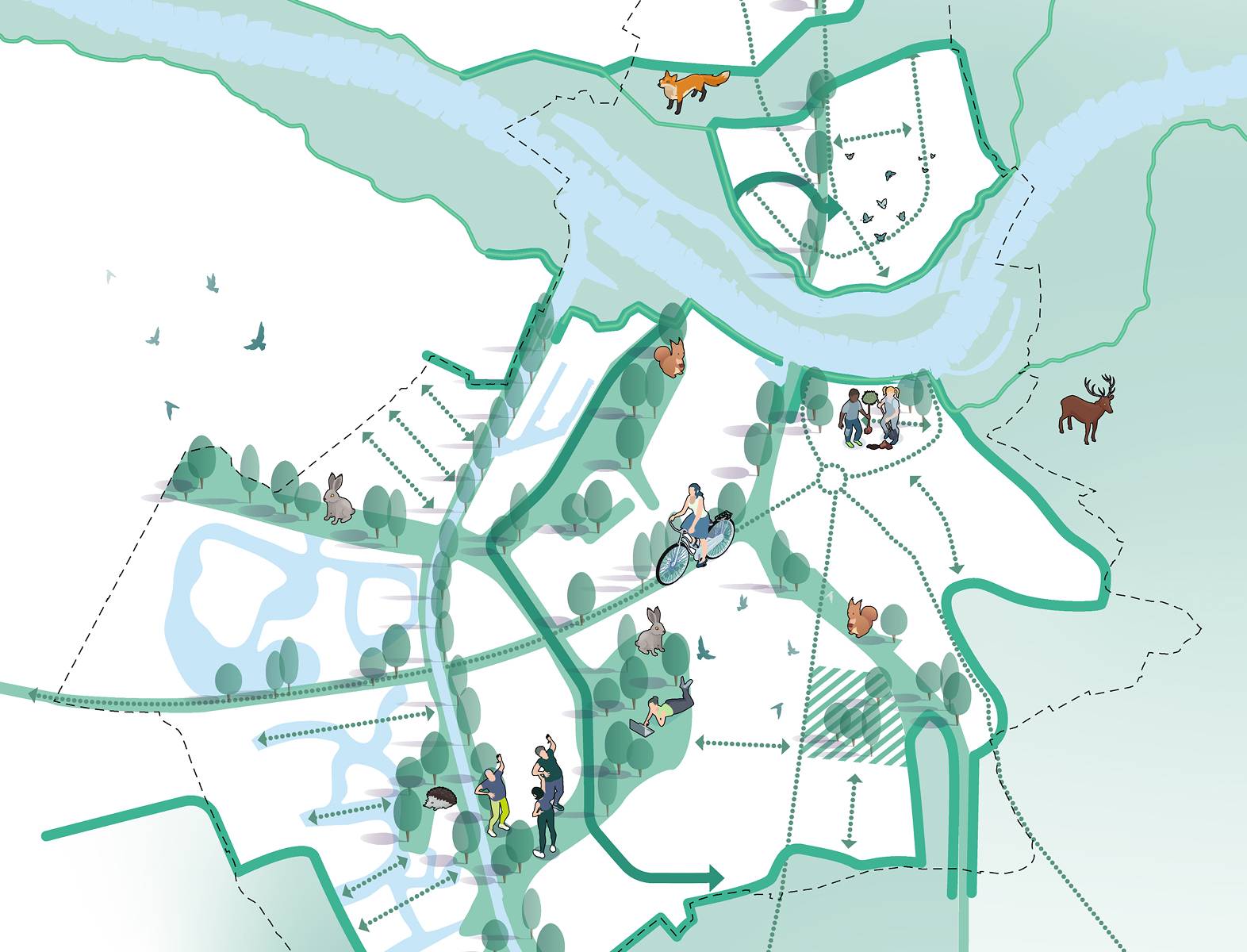 Vanuit een ontwerpend perspectief zijn beleidsambities vertaald naar ruimtelijke keuzes en strategische hoofdstructuren binnen de Omgevingsvisie. Samen met het kernteam van de gemeente onderzochten we hoe principes als nabijheid, rechtvaardigheid en gezondheid ruimtelijk kunnen landen. Ook gaven we vorm aan de ruimtelijke hoofdstructuren, het concretiseren van leidende principes en het ontwikkelen van gebiedsspecifieke ontwikkellijnen.