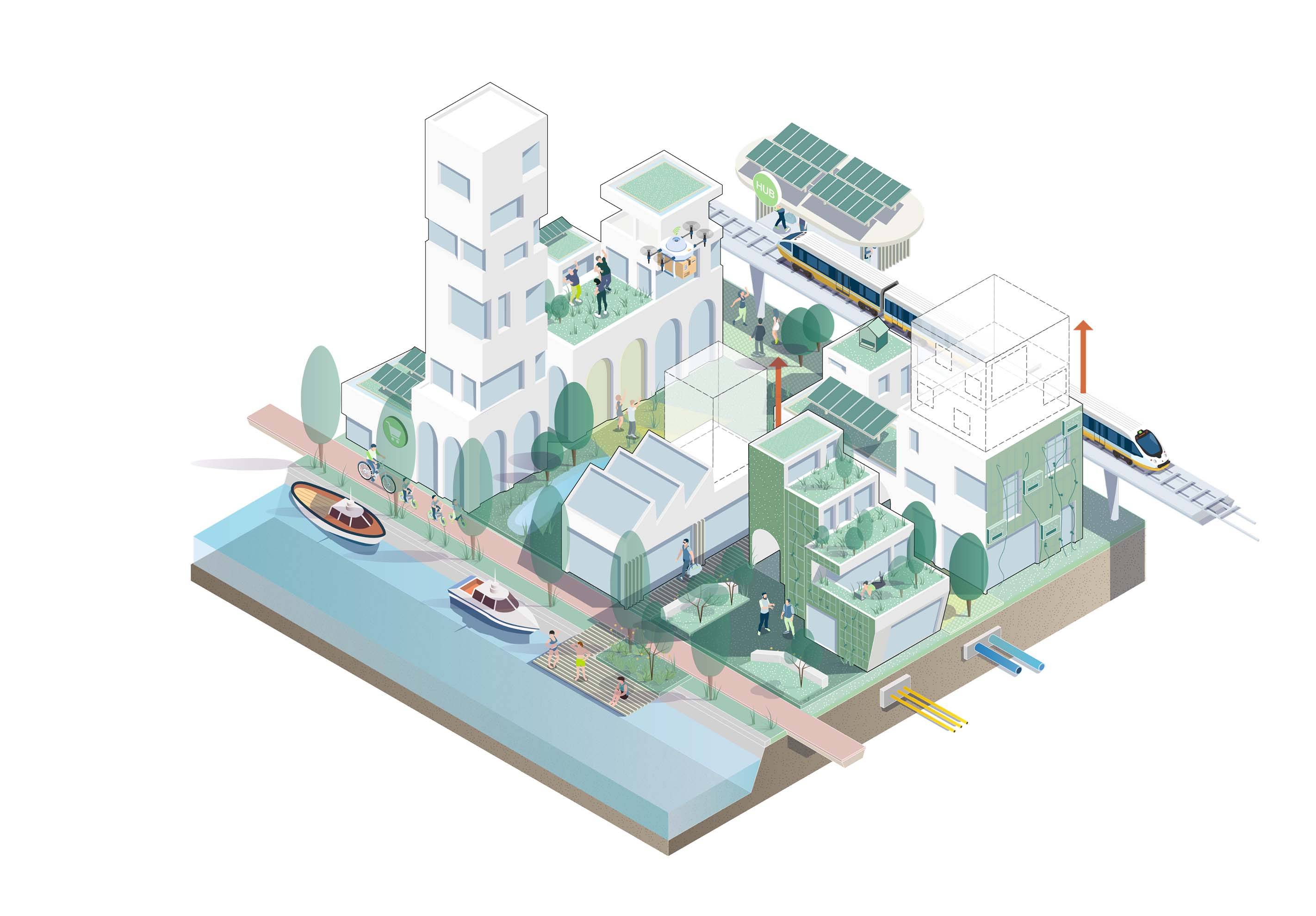 De visie is gestoeld op zes leidende principes, waaronder ‘slim ruimtegebruik’, ‘werken aan brede welvaart’ en ‘bouwen aan een rechtvaardige stad’. Wij hielpen deze principes te vertalen naar concrete ruimtelijke strategieën en gebiedsopgaven. In iedere stadsdeeluitwerking dachten we mee over de juiste balans tussen verdichting, leefkwaliteit en identiteit.