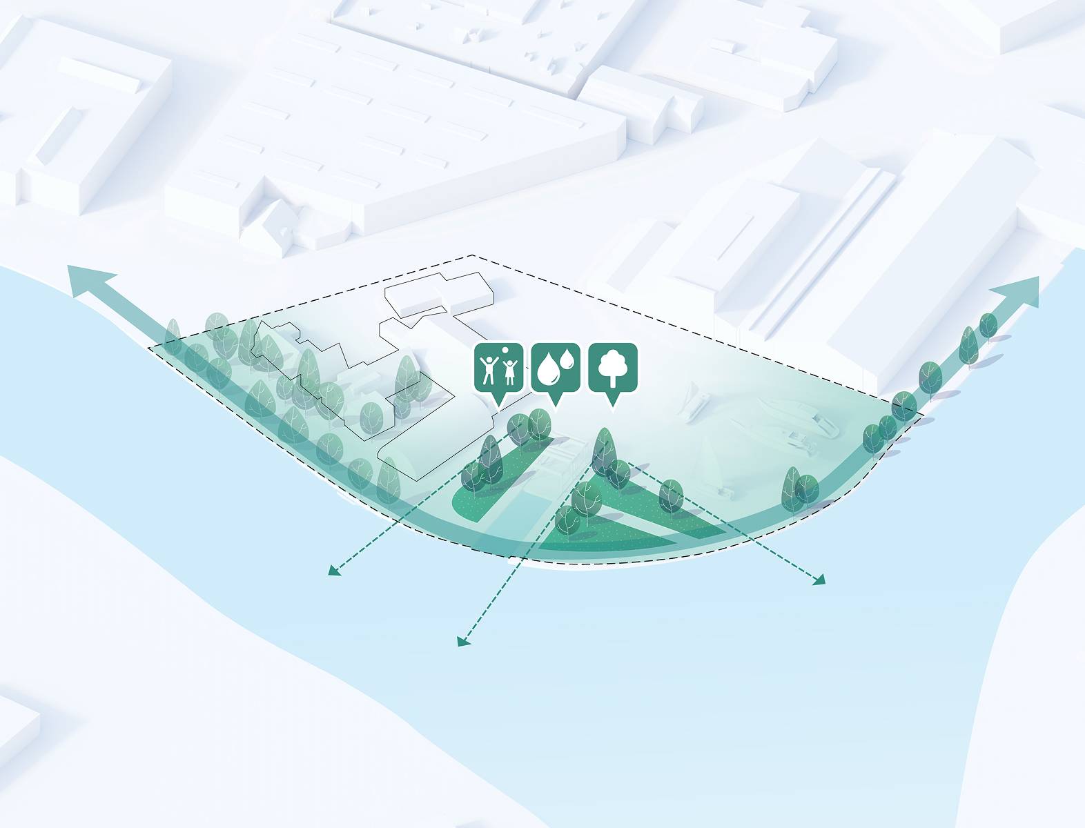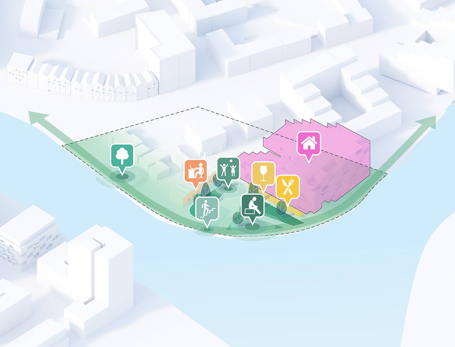 Een nieuw stedelijk ensemble tussen water en stad. Het plan versterkt de verbinding tussen de bestaande wijk en het Alkmaars Kanaal.